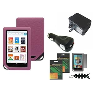 I bought this set for my 5 year old daughter for Christmas. She absolutely loved the pink, textured cover. She gave her Nook a name, Pink Elephant, because of the unique texture on the cover. The texture, helps little hands to keep a good grip on your device, it works very well.The Car USB and Travel USB charger items are worthless without a cable, that is not included. Having ordered this in a hurry before the holidays, I didn't realize this. I was hoping for complete, extra chargers that I could keep in the car and pack for trips.The screen protectors work well and come with everything to install and clean them.