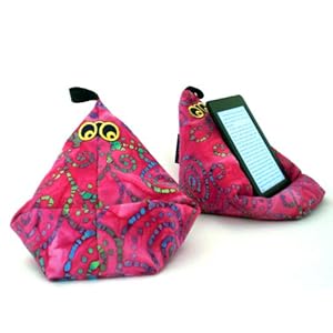 Book Beanie - is an adorable, feather-light bean bag that ingeniously holds ALL models of ereaders, tablets, smartphones. Just "wiggle" to prop it up to your desired viewing angle - then read, watch movies, and view video talk in hands-free comfort. Prepare to smile as it greets you on your nightstand, sofa, table, or on a plane. Enjoy a snack while reading a great ebook. Book Beanie works great on uneven surfaces like your lap, bed, sofa. It can even function as a travel pillow when you get tired reading. The perfect accessory for anyone using an eReader, Tablet, Smartphone. More uses include a soft place to put your eye glasses, a place to put your cell phone so you can find it later. Book Beanies come in a variety of colors and patterns, filled with polystyrene beads. Proudly made in America. Book Beanie works great and is the only e-book stand with personality!